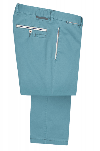 A pair of custom tailored slim-cut men's casual slacks with tailor made on-seam pockets in the front, made to measure double piped back pockets, and excellent detailing.